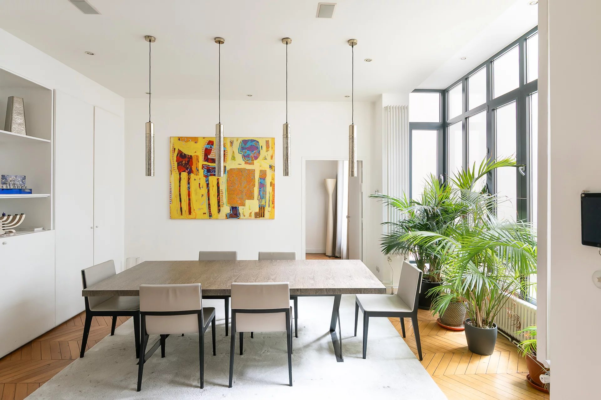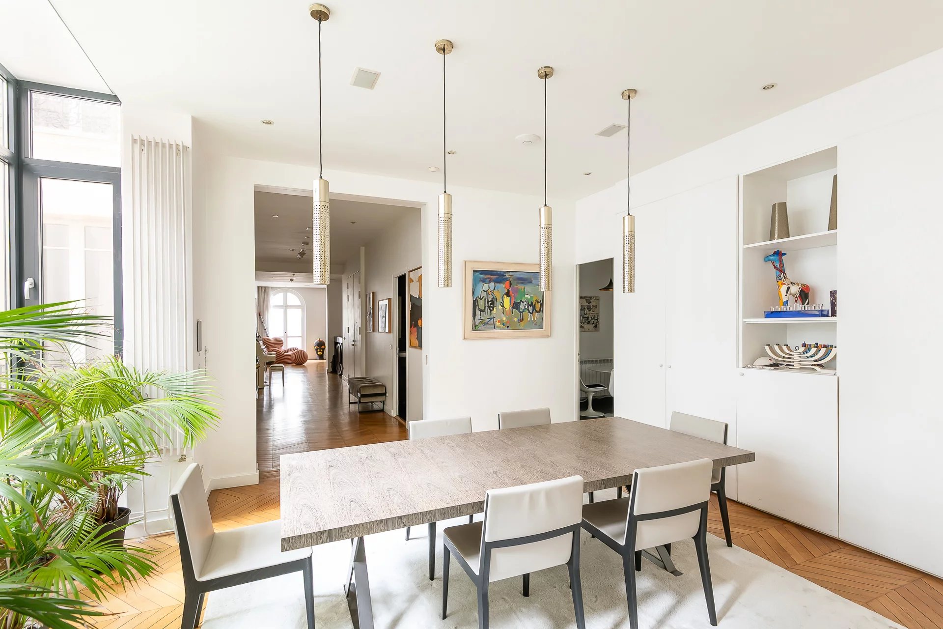 L’entrée s’ouvre sur une pièce de réception de 55 m² bénéficiant de plus de 3 m de hauteur sous plafond, d’un parquet en point de Hongrie.