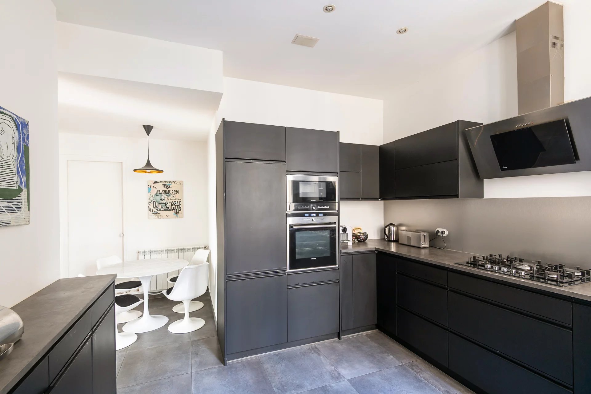 La cuisine dînatoire, entièrement aménagée et équipée, est attenante à une salle à manger sous verrière, un espace lumineux et convivial.